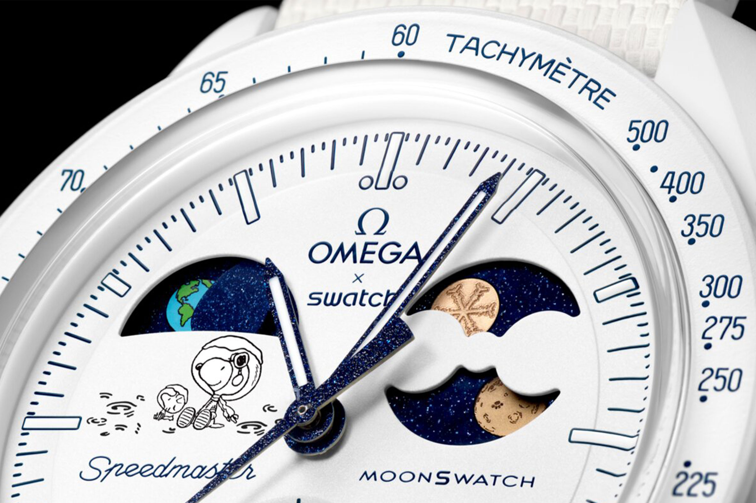Launching worldwide today (5 December), the day of the Cold Full Moon, the new MISSION TO EARTHPHASE – MOONSHINE GOLD watch debuts in winter-white Bioceramic with OMEGA’s Moonshine Gold–adorned moon phase indicator, each uniquely laser-etched with a different snowflake, and featuring snowy Snoopy illustrations, Speedmaster-inspired design codes, and Swatch’s earth and moon phase innovations. Available until 20 March 2026 – and after launch only on days when snow is falling in Switzerland – the model includes a 42 mm case, Grade A Super-LumiNova®, an Earth-inspired battery cover, and a white VELCRO rubber strap, reinforcing its magical winter character and collectible uniqueness.